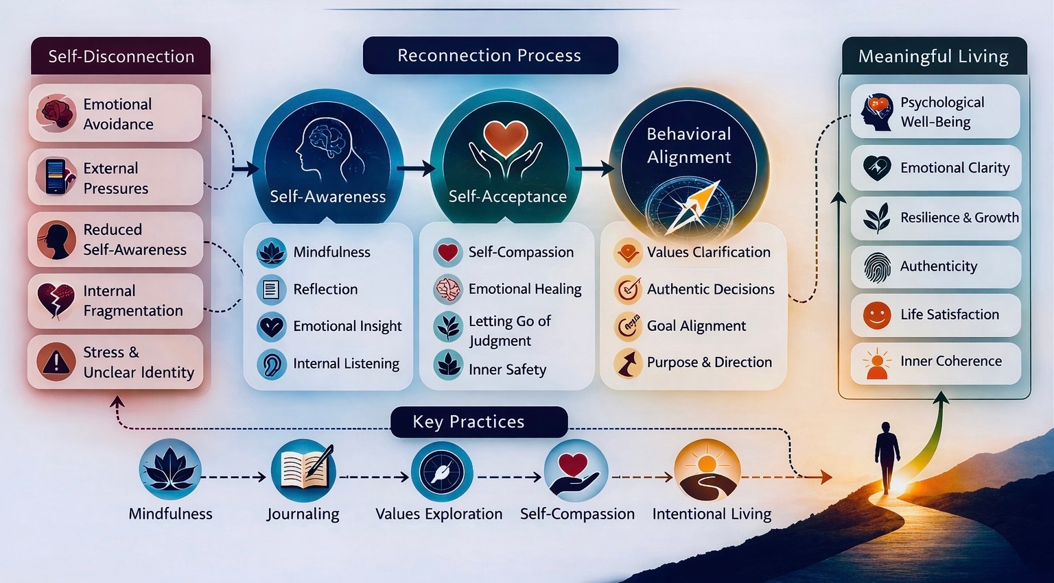 Figure 3. Psychological Pathway From Self-Disconnection to Meaningful Living. Self-connection unfolds as a transition form self-disconnection (e.g., emotional avoidance, external pressures, and internal fragmentation) to meaningful living, meditated by the development of self-awareness, self-acceptance, and behavioral alignment. This process is supported by practices such as mindfulness, reflection, emotional processing, and values-based action.
