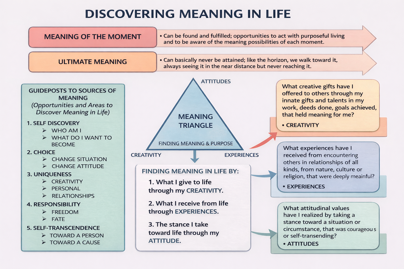 Figure 4. Discovering Meaning In Life. Meaning can be understood as emerging through multiple pathways, including creative contribution (what one gives to life), experiential engagement (what one receives from life), and attitudinal stance (how one responds to circumstances). This model, grounded in logotherapy, emphasizes that meaning is not only found in moments or ultimate purpose, but constructed through self-discovery, choice, personal uniqueness, responsibility, and self-transcendence (Frankl, 1946/2006).