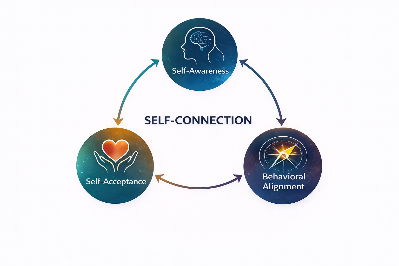 Figure 1. The Self-Connection Triad. Self-connection is conceptualized as a dynamic system consisting of three interrelated components: self-awareness (recognition of internal states), self-acceptance (non-judgmental openness to those experiences), and behavioral alignment (acting in accordance with one’s values and identity). These components function cyclically, such that each reinforces and sustains the others (Klussman et al., 2022).