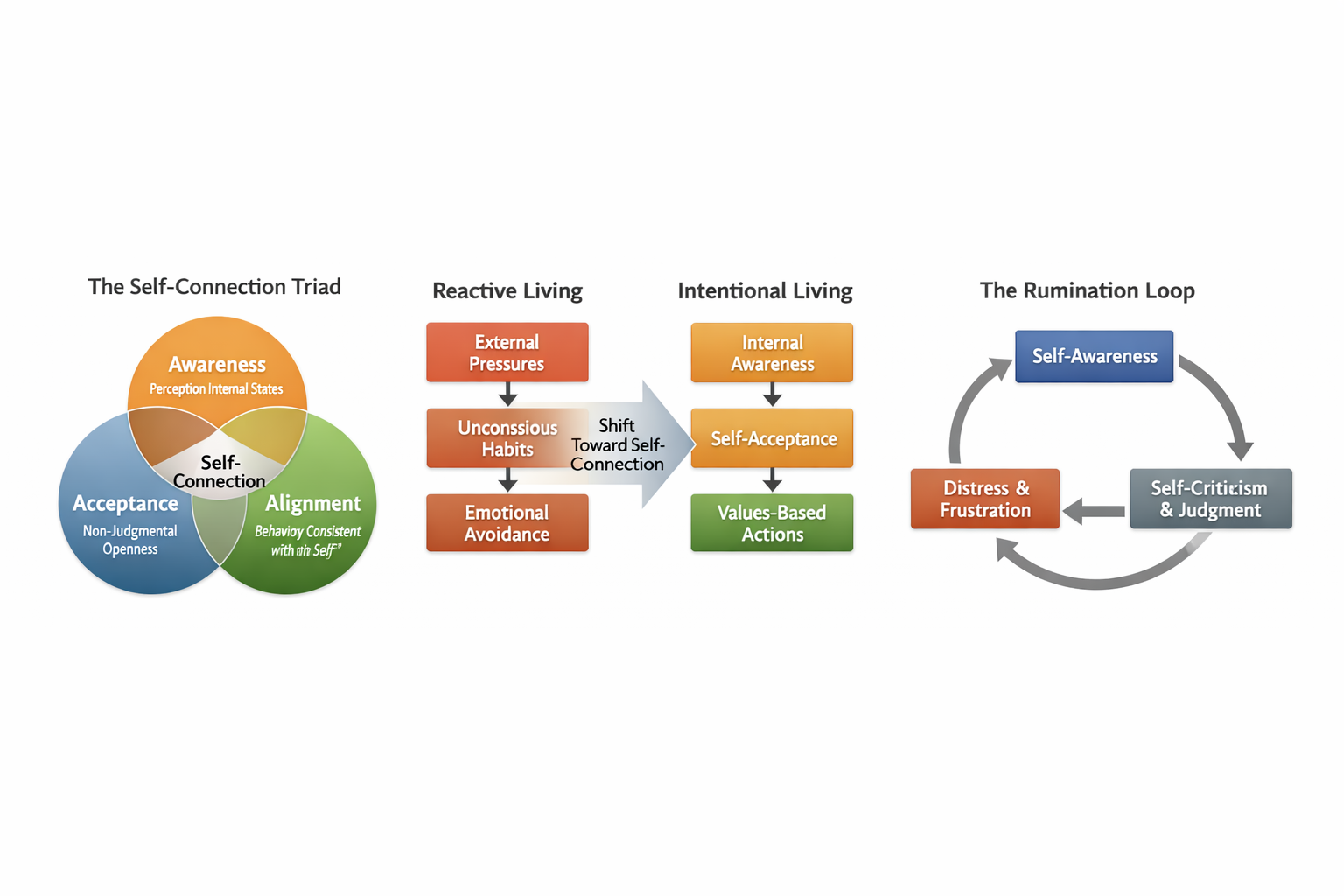 Figure 2. Self-Connection Triad, Behavioral Patterns, and The Rumination Loop. Self-connection is composed of three interrelated components — awareness, acceptance, and behavioral alignment — which together support adaptive, values-based functioning. In contrast, reactive living is characterized by external pressures, unconscious habits, and emotional avoidance, whereas intentional living reflects internally guided awareness, self-acceptance, and values-based action. When awareness is not paired with acceptance, individuals may become trapped in a rumination loop involving self-criticism, distress, and repetitive negative thinking (Smith & Alloy, 2009).