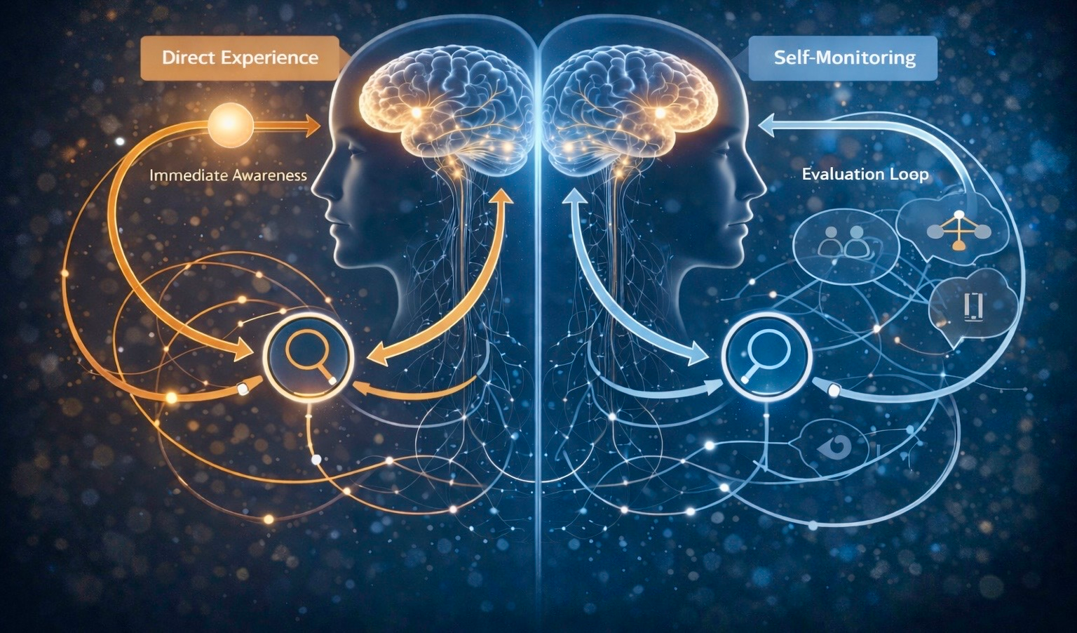 Figure 2. Conceptual Model of Divided Attention Under Performance Mode. The figure illustrates the split between direct experience and self-monitoring described in the article, showing how attention becomes fragmented by evaluation, impression management, and internal pressure.